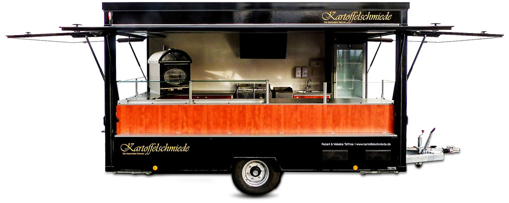 Unsere Kartoffelschmiede ist ein speziell angefertigter Verkaufsstand der Edelklasse auf Rädern. Der Wagen wurde bis ins Detail nach unseren Wünschen gefertigt. Dabei wurden auch alle Arbeitswege und -schritte berücksichtigt, um optimale Ergebnisse zu erzielen. Alle verbauten Geräte und Materialien sind von höchster Qualität. Auch unsere Arbeitskleidung, das Besteck und sogar unseren Suppenkochtopf haben wir farblich perfekt auf den Wagen abgestimmt.